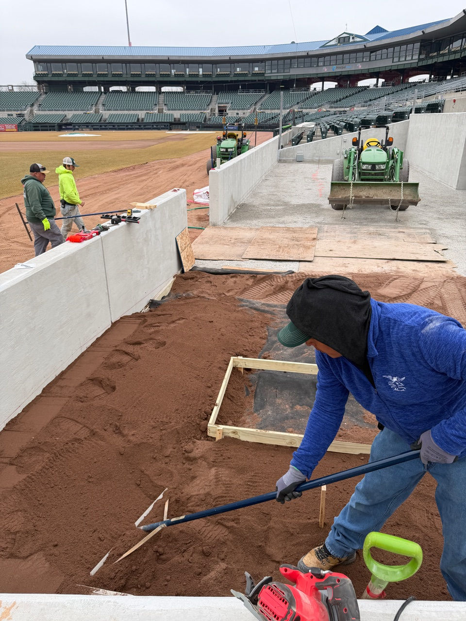 A Bush Sports Turf employee from the Quad Cities tamps the infield mix of sand, clay, and silt in the new home bullpen, one of the final steps to prepare for the Iowa Cubs’ 2026 season at Principal Park. The $790,000 bullpens—a safety measure decreed by Major League Baseball—replace on-field warm-up areas for pitchers and catchers. The I-Cubs meet the Columbus Clippers for the home opener, Friday, March 27. Good seats are still available!!